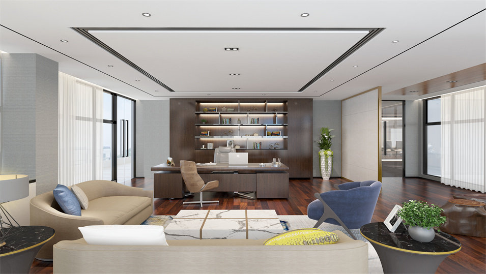 設(shè)計(jì)介紹:主要展示前臺(tái)、洽談區(qū)、走廊、貴賓區(qū)、會(huì)議室、辦公區(qū)等各個(gè)區(qū)域?qū)嵨飯D,設(shè)計(jì)師們采用現(xiàn)代簡約風(fēng)格辦公室設(shè)計(jì),主要以白色為主,藍(lán)色更符合智能化科技的公司形象,通過幾何圖形與條紋裝飾打造科技智能的辦公空間。