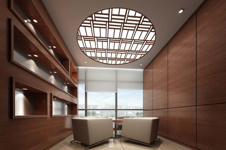 設(shè)計(jì)介紹:現(xiàn)代簡(jiǎn)約凝重風(fēng)如何展現(xiàn)?設(shè)計(jì)師們運(yùn)用棕色的色調(diào)表現(xiàn)出凝重感,頂部圓形中國風(fēng)網(wǎng)狀帶有悠久的中國藝術(shù),天圓地方設(shè)計(jì),使人一進(jìn)入到這個(gè)辦公室給人與專業(yè)、理性的感覺,這點(diǎn)特別符合公司的企業(yè)文化。