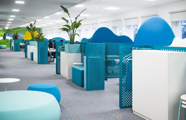 4、動(dòng)漫公司辦公室裝修:以一個(gè)開放式的辦公環(huán)境為宗旨,旨在培養(yǎng)員工的團(tuán)隊(duì)協(xié)作能力和溝通能力,而隨處可見(jiàn)的沙發(fā)座椅大大方便了員工之間的溝通交流。放松心情的辦公氛圍也使得靈感隨時(shí)都有可能迸發(fā),公司員工能夠享受到以任何自己喜歡的方式進(jìn)行靈感的創(chuàng)作。除了主要的工作區(qū)域,辦公室的其他功能區(qū)也各具特色。以天然綠色為背景的圖書館能夠?yàn)閱T工提供寧?kù)o安逸的閱讀空間,另外還有包括蹦床、球類等讓員工可以盡情玩樂(lè)游戲室,閑暇之余聊天放松的咖啡廳。而餐廳的設(shè)計(jì)有吸引力,將餐廳設(shè)計(jì)成一個(gè)復(fù)古的美式游樂(lè)園,搖椅或旋轉(zhuǎn)木馬般的座位,極具童心童趣。
