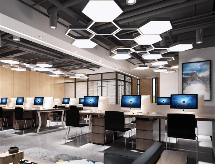 3、整體空間以現(xiàn)代科技感為主,運(yùn)用線條燈來營造空間的整體氛圍,提升科技感的體驗(yàn),在局部用活躍的顏色來跳動整個空間的色彩,形成不一樣的風(fēng)格。會議室設(shè)計(jì)裝修使用簡潔明了的軟膜天花,給予整個空間的光線之外,形成了自己獨(dú)特的裝飾作用。員工辦公室設(shè)計(jì)用六邊形的蜂巢燈具來打亂整個空間的死板性,讓整個空間更具有創(chuàng)新力。